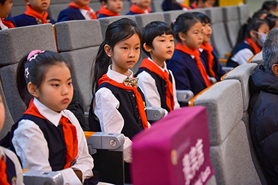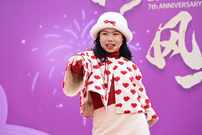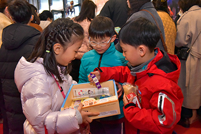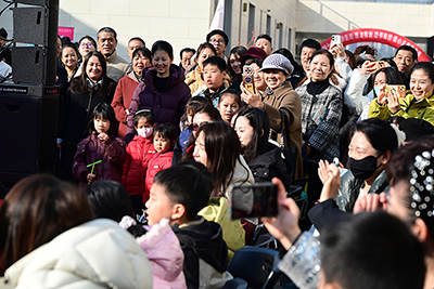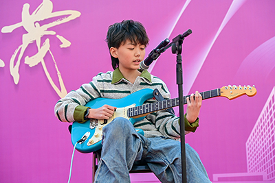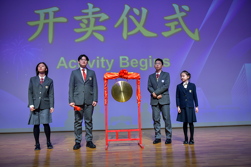 在热烈的掌声中,学生代表杨同学、杜同学、单同学、刘同学一同登台,执锤击响铜锣。随着一声清亮悠长的锣音回荡全场,爱心园游会,正式开市!