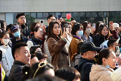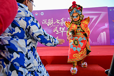 在热烈的掌声中,学生代表杨同学、杜同学、单同学、刘同学一同登台,执锤击响铜锣。随着一声清亮悠长的锣音回荡全场,爱心园游会,正式开市!